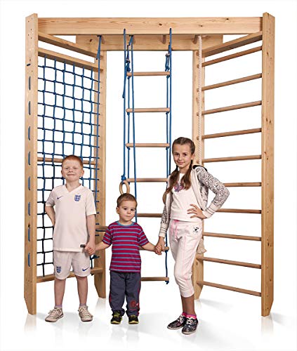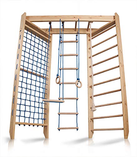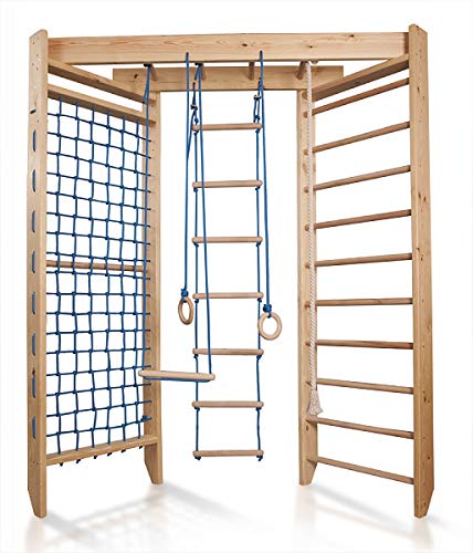 Das Paket beinhaltet: Sprossenwand (Sicherheitszertifikat: SIST EN 1176-1:2008) durch Stange, Strickleiter, Kletterseil, Ringe zum Turnen, Schaukel, Wandmontage-Set