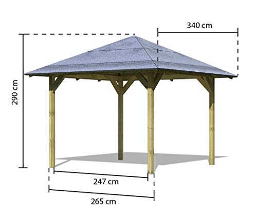 Außenmaß (B x T): 265 x 265 cm Dachstand (B x T): 248 x 248 cm Pfostenstärke: 9 x 9 cm umbauter R