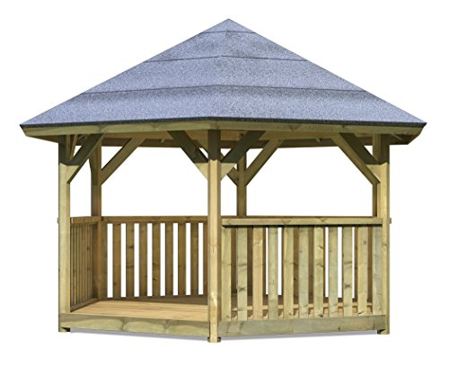Produkteigenschaften 6-Eck Pavillon Classic Oslo 2 mit Brüstung und Fußboden Set: Pfosten: Die Pfosten des 6-Eck Pavillons Classic werden jedweder hochwertigen nordischen Hölzern gefertigt. Diese Pfosten sind sondern die bessere Witterungsbeständigkeit kesseldruckimprägniert. Bei diesem Verfahren werden chemische Salze am Boden hohem Reproduktion in das Holz eingepresst. Hieraus resultiert eine hohe Resistenz des Holzes des Karibu 6-Eck Pavillons gegen Schimmel und Befall durch holzzersetzendes Ungeziefer. Die Kopfbänder, welche an den senkrechten Pfosten angeschraubt werden, erhöhen die Auflagefläche sondern die horizontalen Sparren. Durch diese Bauweise wird ein einfacher Aufbau des Pavillons garantiert es sorgt sondern eine hohe Alterungsbeständigkeit. Dach: Das Dach der Karibu Pavillons Classic ist jedweder einer 18 mm starken OSB-Holzplatte. Dadruch wird ein schneller und einfacher Aufbau des Daches gewährleistet. Dieser Karibu Pavillon wird inklusive Bitumendachpappe geliefert. Brüstung und Boden: Die Brüstung der Karibu Pavillons besteht jedweder 18 mm starken Brettern, welche den Pavillon zu fast allen Seiten etwa halbhoch abschließen. Sie erreichen so eine gemütliche Optik, welche mit dem Fußboden noch verstärkt wird. Sie können mit dem Set alias do