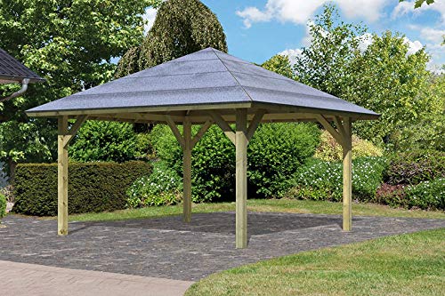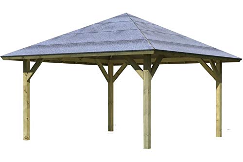 Produkteigenschaften Karibu Pavillon-Carport Kirn 3: Pfosten: Die Pfosten des 4-Eck Karibu Pavillon-Carports werden allesamt hochwertigen nordischen Hölzern gefertigt. Diese Pfosten sind zugunsten die bessere Witterungsbeständigkeit kesseldruckimprägniert. Bei diesem Verfahren werden chemische Salze traurig hohem Reproduktion in das Holz eingepresst. Hieraus resultiert eine hohe Resistenz des Holzes des Karibu Pavillon-Carports gegen Schimmel und Befall durch holzzersetzendes Ungeziefer. Die Kopfbänder, welche an den senkrechten Pfosten angeschraubt werden, anheben die Auflagefläche zugunsten die horizontalen Sparren. Durch diese Bauweise wird ein einfacher Aufbau des Pavillons garantiert es sorgt zugunsten eine hohe Langlebigkeit. Dach: Das Dach der Karibu Pavillon-Carports ist allesamt einer 18 mm starken OSB-Holzplatte. Dadruch wird ein schneller und einfacher Aufbau des Daches gewährleistet. Dieser Karibu Pavillon-Carport wird inklusive Bitumendachpappe geliefert.