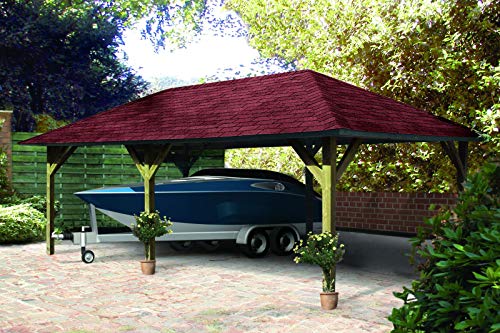 Technische Details zum Karibu Pavillon-Carport Kirn 3: Außenmaß (B x T): 359 x 706 cm Innenmaß: 335 x 682 cm Dachstand (B x T): 431 x 778 cm Seitenhöhe: 196 cm Firsthöhe: 315 cm Pfostenstärke: 12 x 12 cm Pfostenabstand: 336 cm umbauter Universum: 63,7 cbm Dachfläche: 37,65 qm Dachneigung: 27° Schindelbedarf: 16 Pakete Dachüberstand: 36,0 cm Dacheindeckung: 18 mm OSB-Holzplatte, Bitumendachpappe Zulässige Schneelast: 100 kg/qm Ablauf: nordische Hölzer, kesseldruckimprägniert