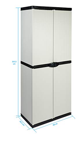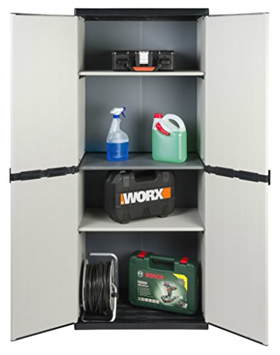Lieferumfang: 1 x Kunststoff Spindschrank mit praktischem Freifach für sperrige Gegenstände | 1 x Kunststoffschrank mit 3 höhenverstellbaren Böden, zwei davon höhenverstellbar. Jeder Boden abgehärtet mit bis zu 20 kg.