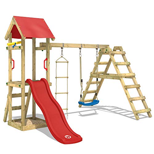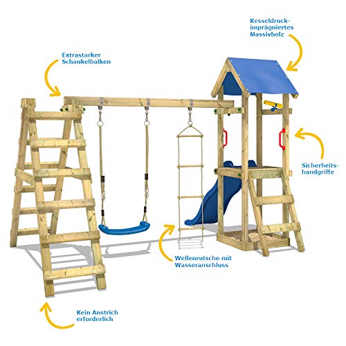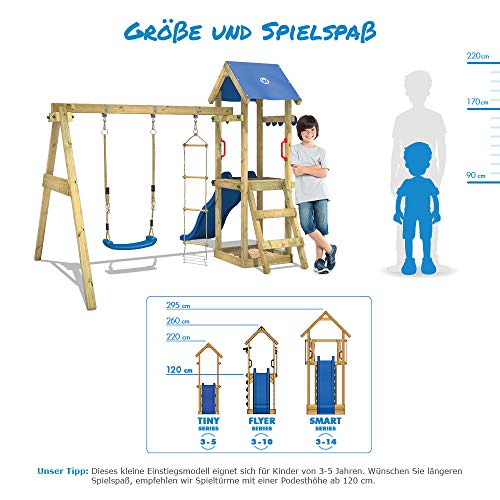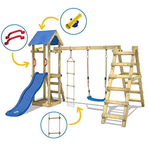 Kompakter Kinderspielturm mit Wellenrutsche, Schaukel und Kletteranbau – Altersempfehlung 3-5 Jahre