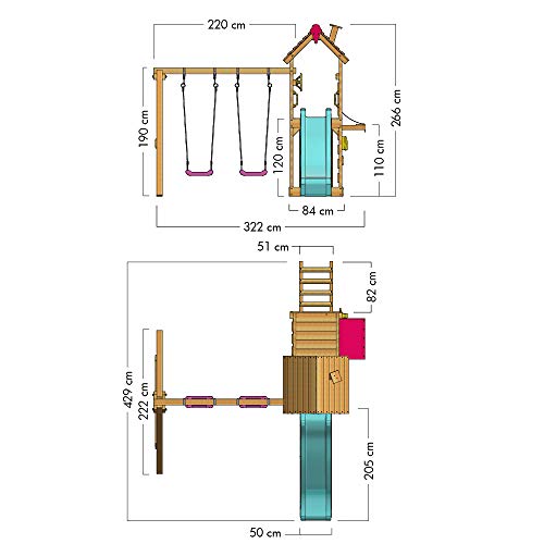 Kletterturm per Doppelschaukel und Wellenrutsche – Pfostenstärke 9×4,5 cm – Schaukelbalken 9×9 cm