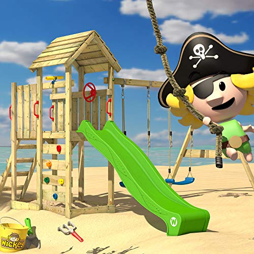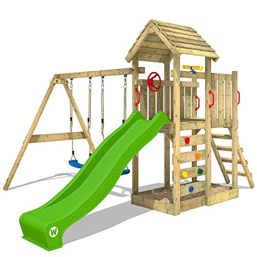WICKEY Spielturm Klettergerüst MultiFlyer mit Holzdach, Schaukel & apfelgrüner Rutsche, Outdoor Kinder Kletterturm mit…