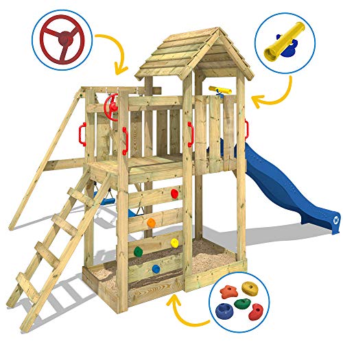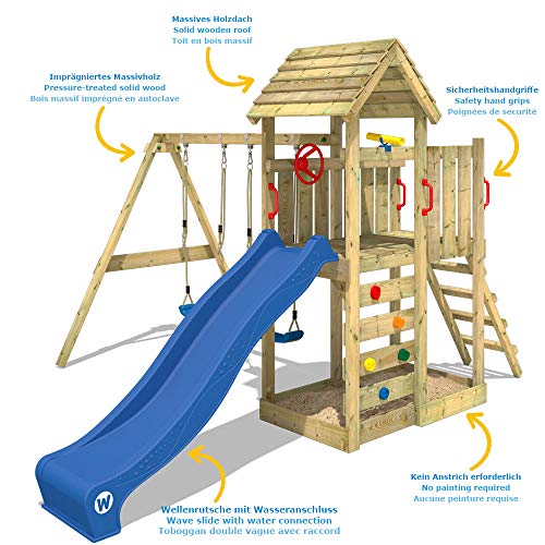 WICKEY Spielturm inkl. komplettem Zubehörset mit Holzdach, Schaukel, Rutsche und extrabreitem Podest