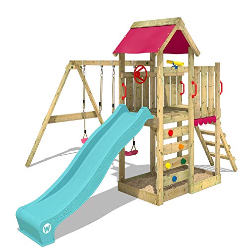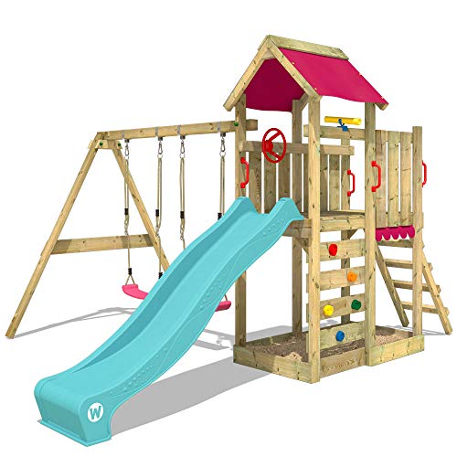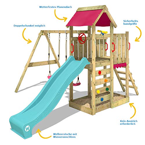 WICKEY Spielturm Klettergerüst MultiFlyer mit Schaukel & türkiser Rutsche, Outdoor Kinder Kletterturm mit Sandkasten, Leiter & Spiel-Zubehör für den Garten