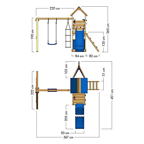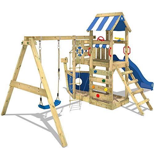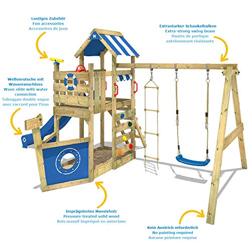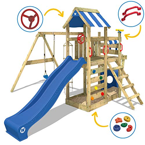 WICKEY Spielturm Klettergerüst SeaFlyer mit Schaukel & Blauer Rutsche, Outdoor Kinder Kletterturm mit Sandkasten, Leiter…