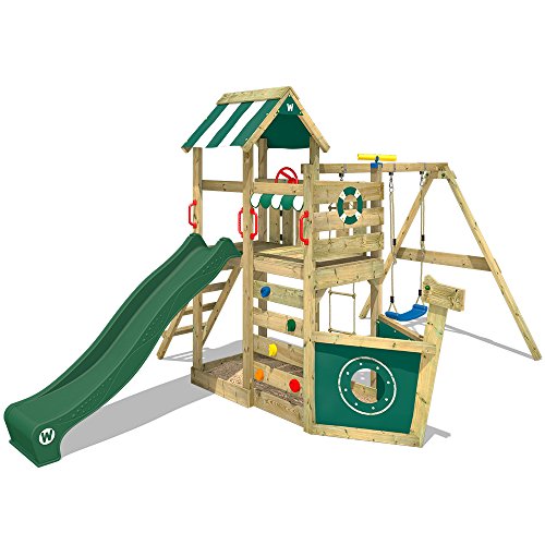 WICKEY Spielturm Klettergerüst SeaFlyer mit Schaukel & grüner Rutsche, Outdoor Kinder Kletterturm mit Sandkasten, Leiter…