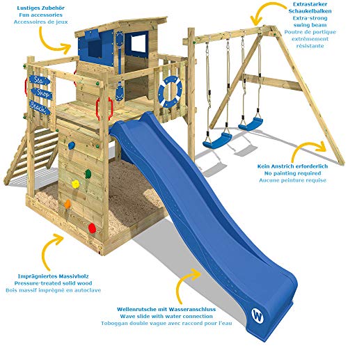 WICKEY Spielturm Klettergerüst Smart Camp mit Schaukel & grüner Rutsche, Outdoor Kinder Kletterturm mit Sandkasten, Leiter & Spiel-Zubehör für den Garten