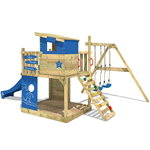 Stylishes Strand-Baumhaus mit Doppelschaukel, Kletterwand, großem Sandkasten, Rutsche, flachem Holzdach und Sitzbank