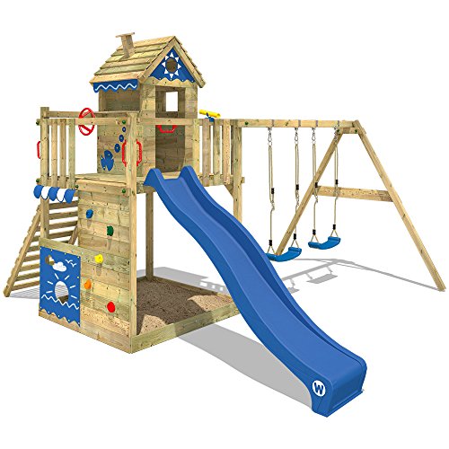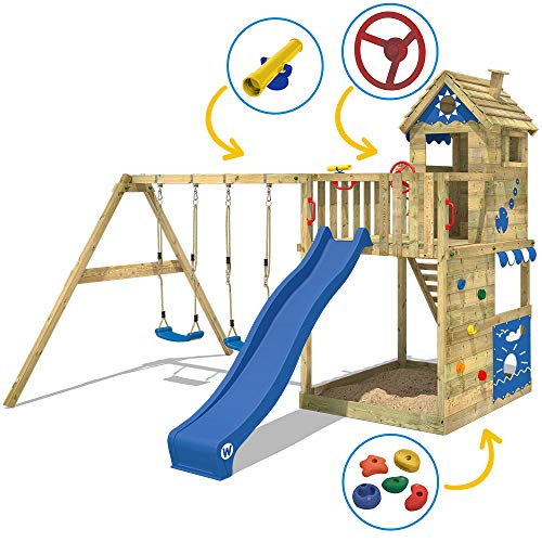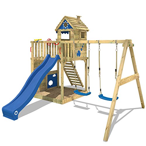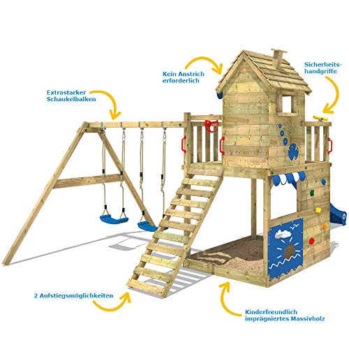 Stelzenhaus mit Wellenrutsche, Schaukel, Sandkasten, Kletterleiter, Kletterwand, Sicherheitsgriffen u.v.m. – Smart-Aufeinanderfolge