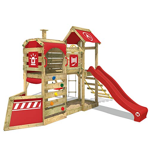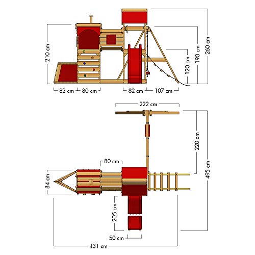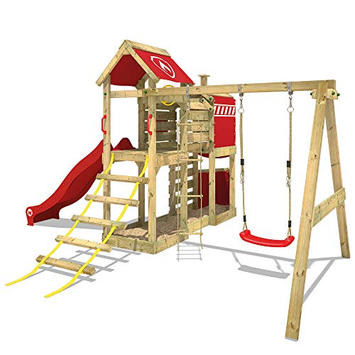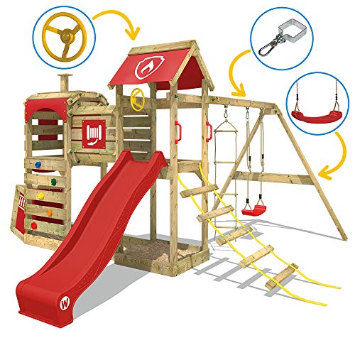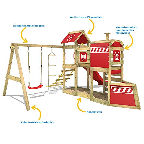 Kletterturm mit Wellenrutsche, Schaukel, Sandkasten, Strick- und Wackelleiter, Kletterwand & Spiel-Zubehör – Flyer-Aufstellung