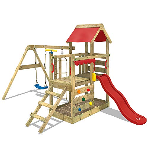WICKEY Spielturm Klettergerüst TurboFlyer mit Schaukel & roter Rutsche, Outdoor Kinder Kletterturm mit Sandkasten, Leiter & Spiel-Zubehör für den Garten