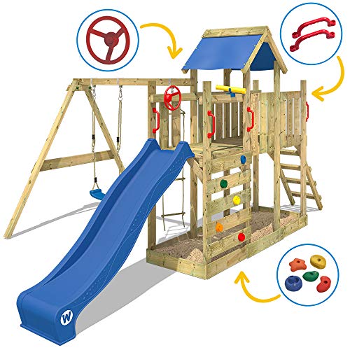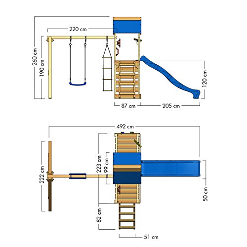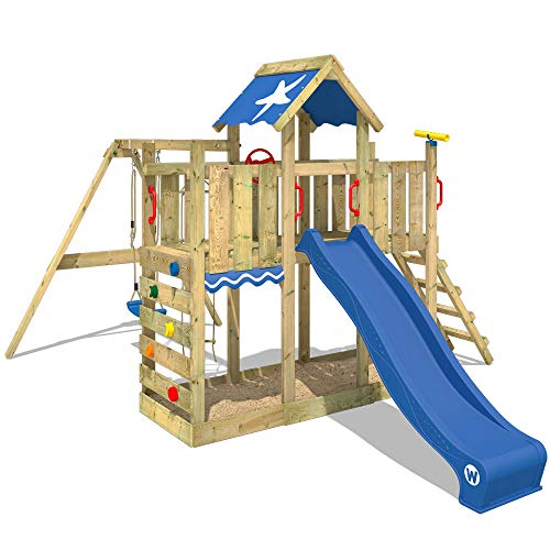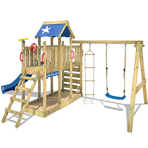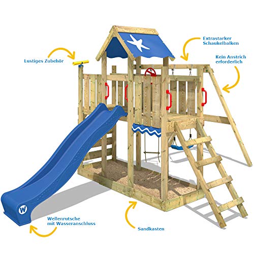 Holz-Spielgerät mit Wellenrutsche, Schaukel, Sandkasten, Strickleiter, Kletterwand & abundant Spiel-Zubehör – Flyer-Sukzession