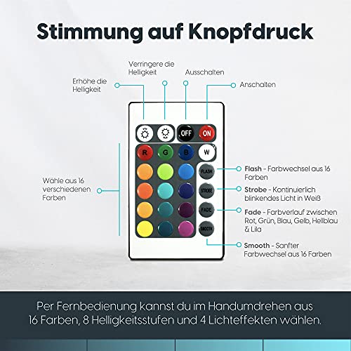 FARBENFROH. Per Fernbedienung kannst du im Handumdrehen sämtliche 16 Farben, 8 Helligkeitsstufen dimmbar und 4 Lichteffekten „Flash“, „Strobe“, „Fade“ und „Smooth“ Entscheidung und mit Kubi Wohlfühlatmosphäre oder Partystimmung auf Knopfdruck erzeugen.