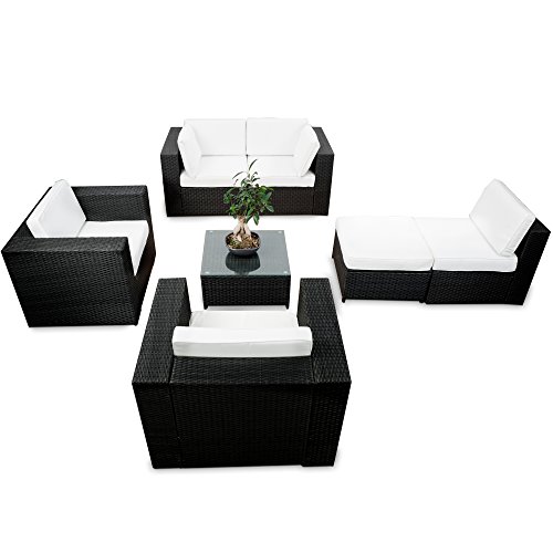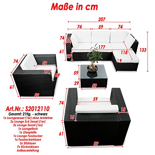 ❖ Farbe: schwarz (anhrazit) ❖ Lieferumfang: 2x 1er Loungesessel, 2x Lounge Ecksessel – Element, 1x Lounge Mittelsessel Element, 1x Polyrattan Tisch mit Sicherheitsglasplatte, 1x Lounge Hocker, ganz abgebildete Auflagen