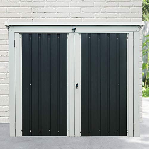 Der Gartenschrank besteht allesamt verzinktem und lackiertem Stahlblech und hält also jedem Wetter stand. Mit einem Außenmaß von (B) 158 x (T) 101 x (H) 134 cm haben Sie genügend Platz zum Verstauen von Gartenmöbel, Sitzkissen, Fahrräder oder Gartengeräte.