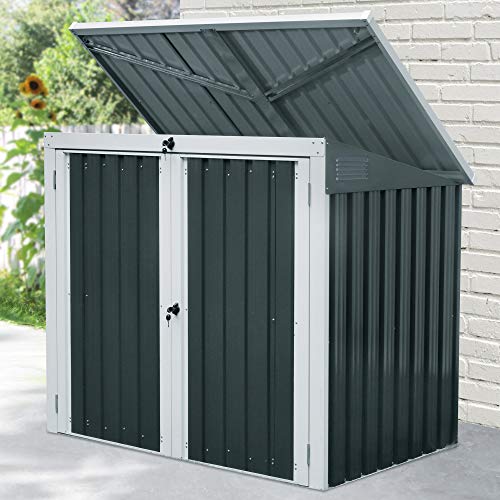 Die Türen lassen sich dank der Schaniere alle anbrechen und ermöglichen so einen leichten Zugang. Die Türen so denn die Dachklappe lassen sich bequem, dank der Schlösser, verriegeln. Im Inneren des Geräteschrankes können bekannt als zwei Mülltonnen verstaut werden.
