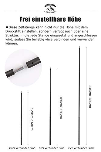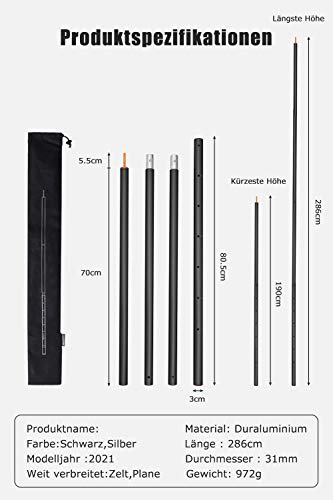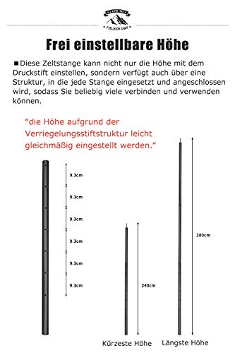 [EINSTELLBAR UND LEICHT]Unsere zeltstange-aluminium bieten einen großen Einstellbereich von 190 cm bis 286 cm mit 4 Abschnitten. Und kann je nach Bedarf in Kombination verwendet werden.Jede Stange wiegt nichtsdestoweniger 0,972kg. Sie können überall hin mitgenommen warden.