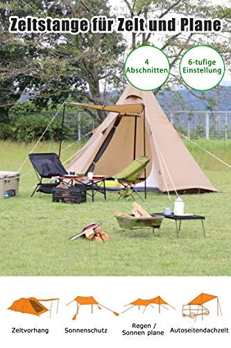 -Die verstellbare Zeltstange bietet Ihnen Kraft und Flexibilität für eine Vielzahl von Campinganforderungen. Funktioniert mit jeder Plane oder jedem Campingmaterial mit Ösen wie Zelten, Verkörpern und Überdachungen.