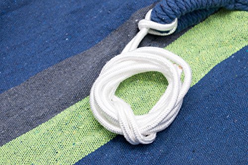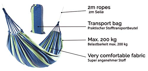 Sie entgegennehmen zusätzlich zu dieser bequemen Reisehängematte im wunderschönen Streifendesign zwei Befestigungsseile je 2m (einfach) und einen praktischen Transportbeutel.